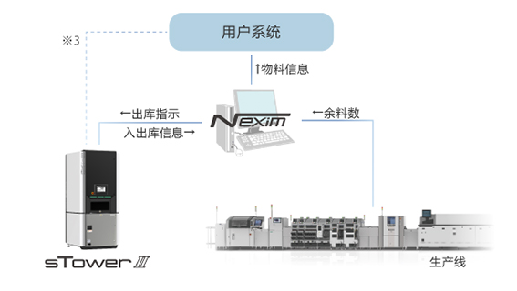 與綜合生產(chǎn)系統(tǒng)Nexim搭配使用時(shí),可根據(jù)生產(chǎn)計(jì)劃,或料盡預(yù)告完成自動(dòng)出庫(kù)。
